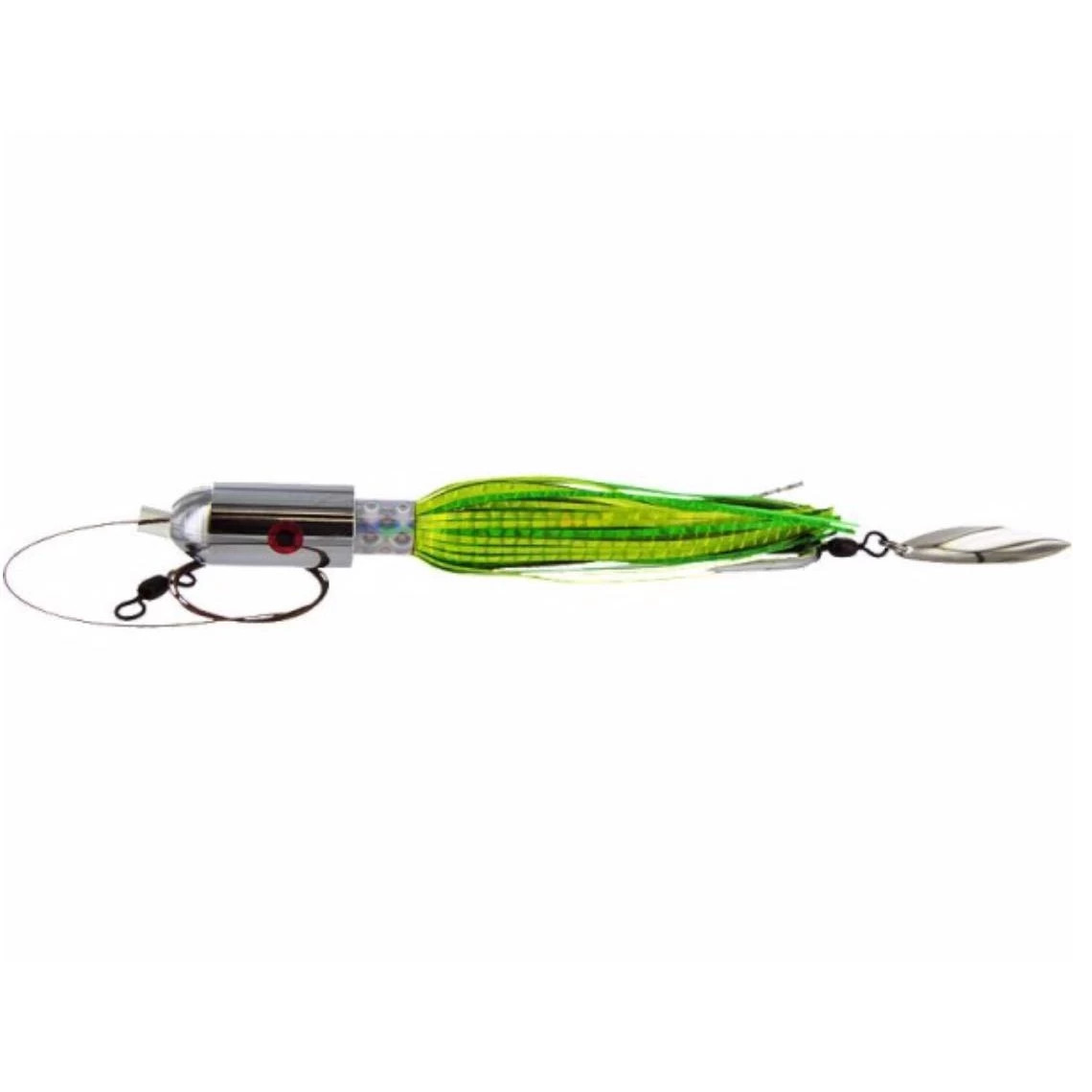 Catchy Tackle Wahoo Bombs are the best in the business with extreme attention to detail and quality components.  The mylar skirt gives off a ton action and flash while the willow blade of the rear spins on a heavy duty swivel.  The Catchy Tackle Wahoo Bombs are fitted with 4x strong hook will stand up to the biggest baddest fish in the ocean and the heavy wire and swivels won’t fail you.  If you target wahoo, tuna, or billfish, this lure is the bomb.