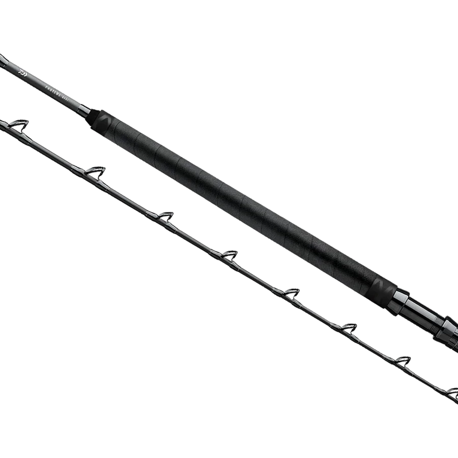 The Daiwa Proteus Tuna Special Rail Rod is the next evolution in big tuna rail fishing rods. Developed years ago, this technique has evolved into a much more private boat technique with the arrival of giant bluefin tuna here on the west coast. Extremely durable fore grip which is meant for resting on the rail This material is similar to tire rubber and can be moved up and down the rail without a scratch or without compressing.