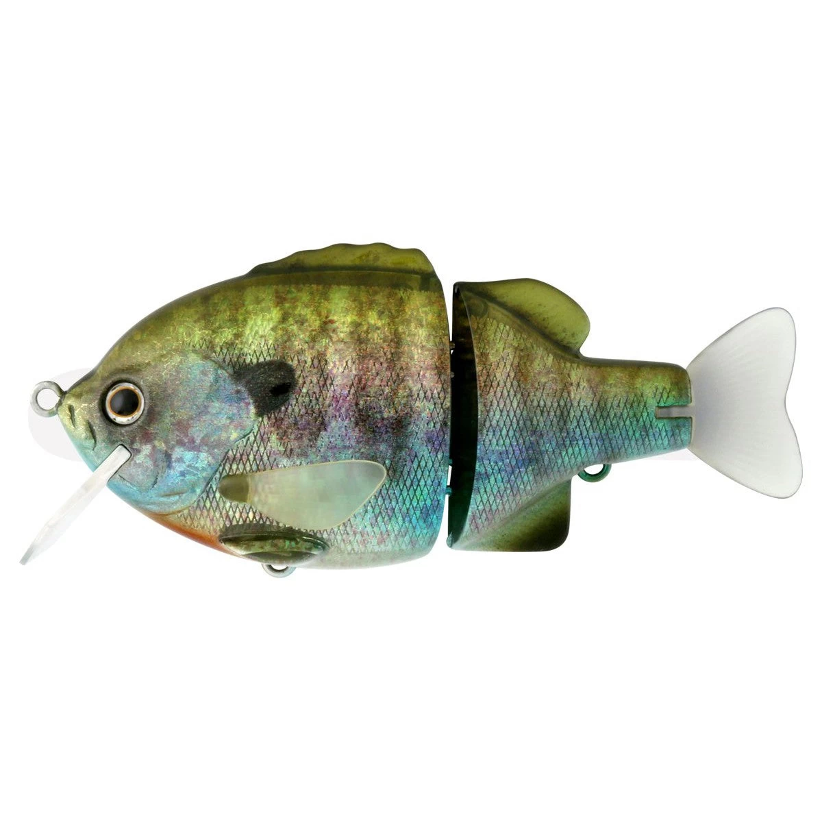 Pectoral fins made of a durable PVC material that sticks to the body during the retrieve and when stopped, it moves and hovers like live bluegill.