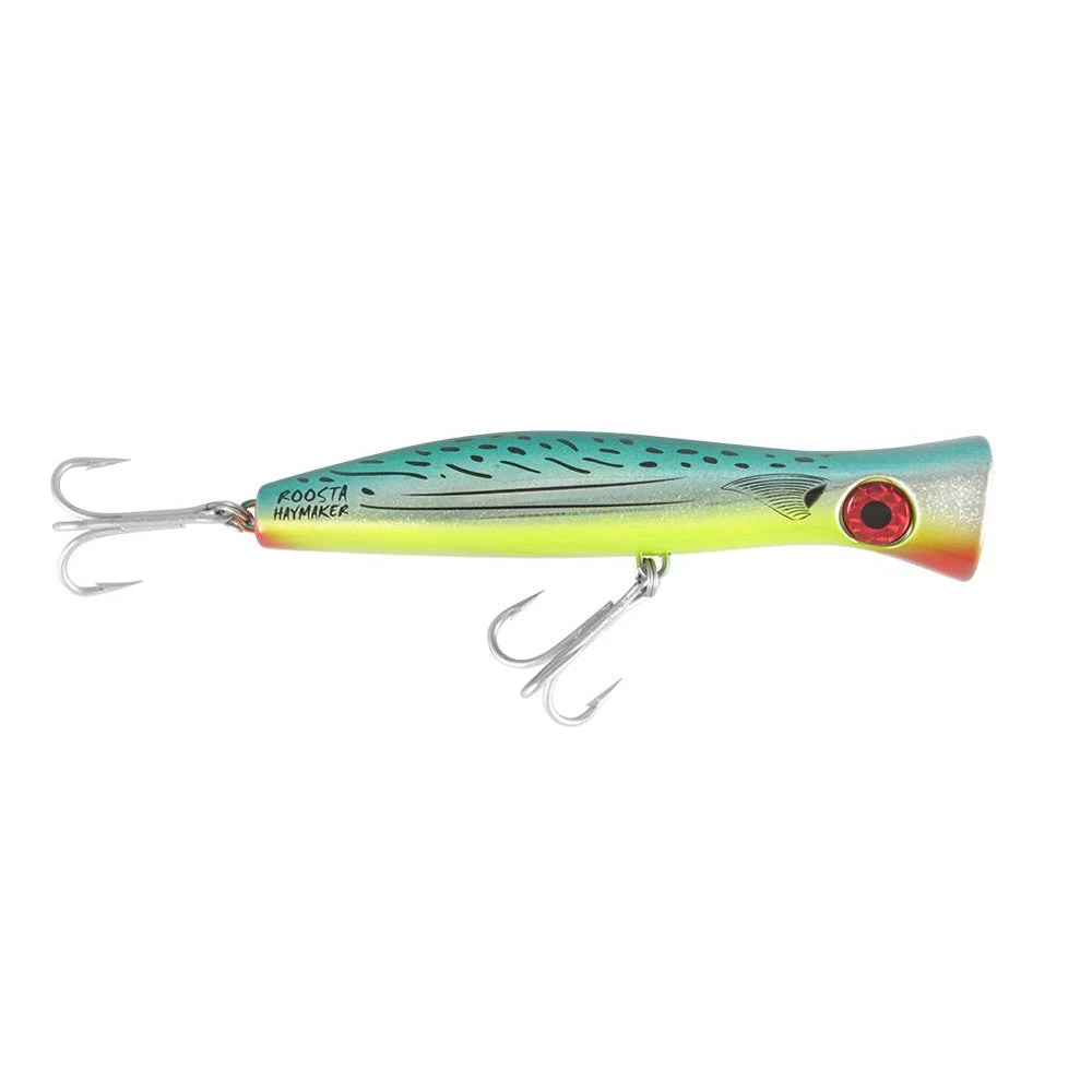The Halco Roosta 195 Haymaker is designed for catching some of the toughest fish that swim, from Giant Trevally to Dogtooth Tuna. It is built with extra heavy duty, custom made 7xx fish rings and is equipped with Mustad 5 extra strong 5/0 trebles. While designed with a blooping style retrieve in mind, the Roosta Haymaker can be simply wound in at speed or trolled for excellent results.The recommended method of retrieval for best results is to point the rod tip at the lure, retrieve any slack line and firmly sweep the rod tip in a downward motion approximately 45 degrees. Allow the lure to rest for several seconds and if a fish hasn’t taken the lure repeat as necessary.
