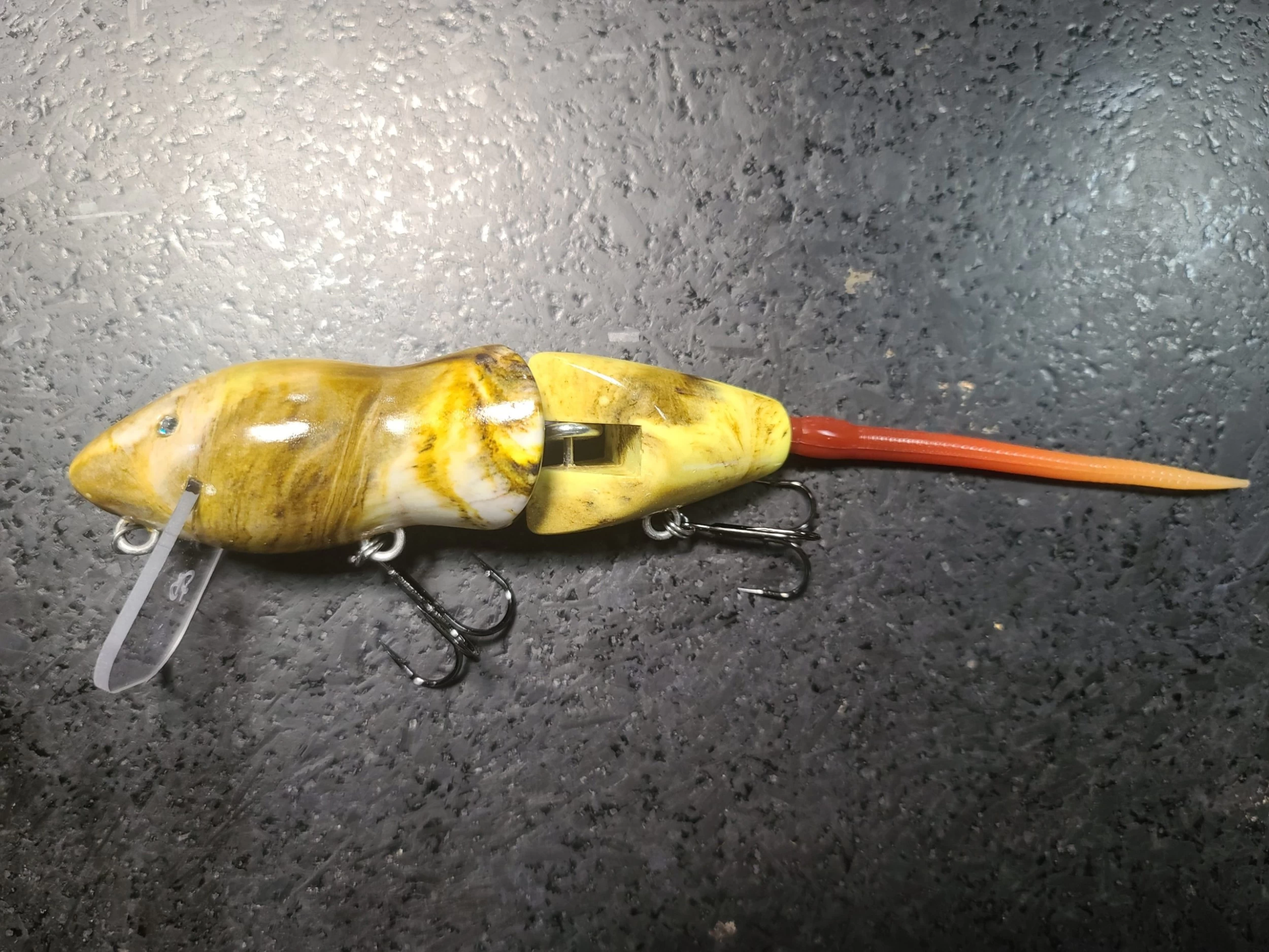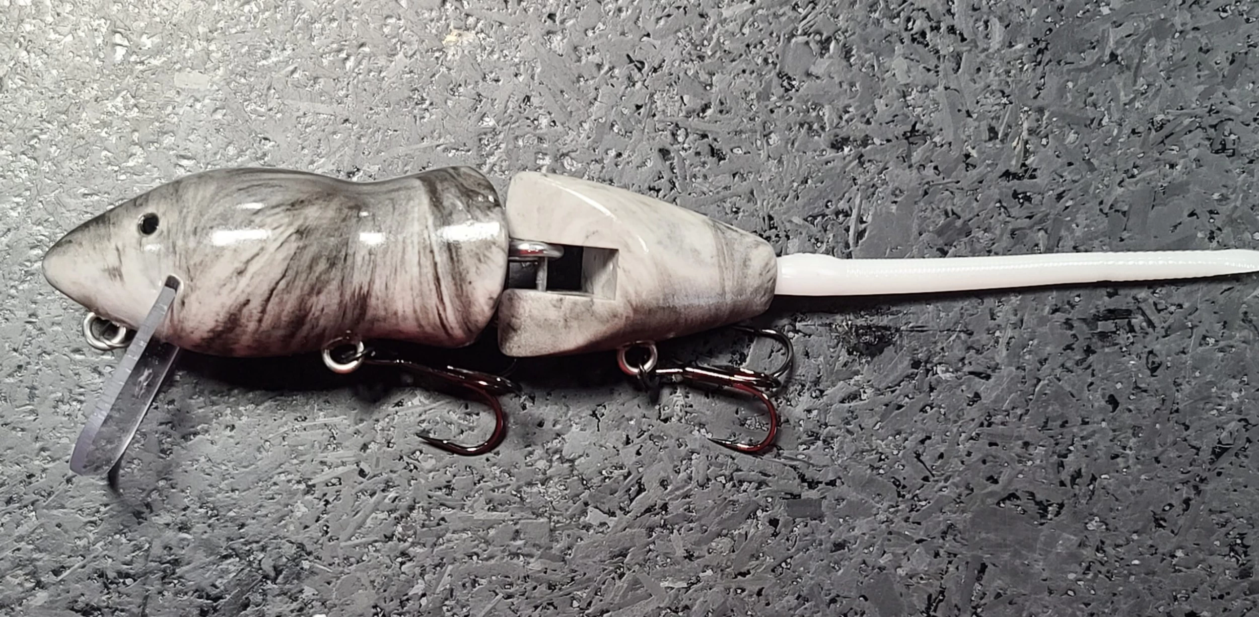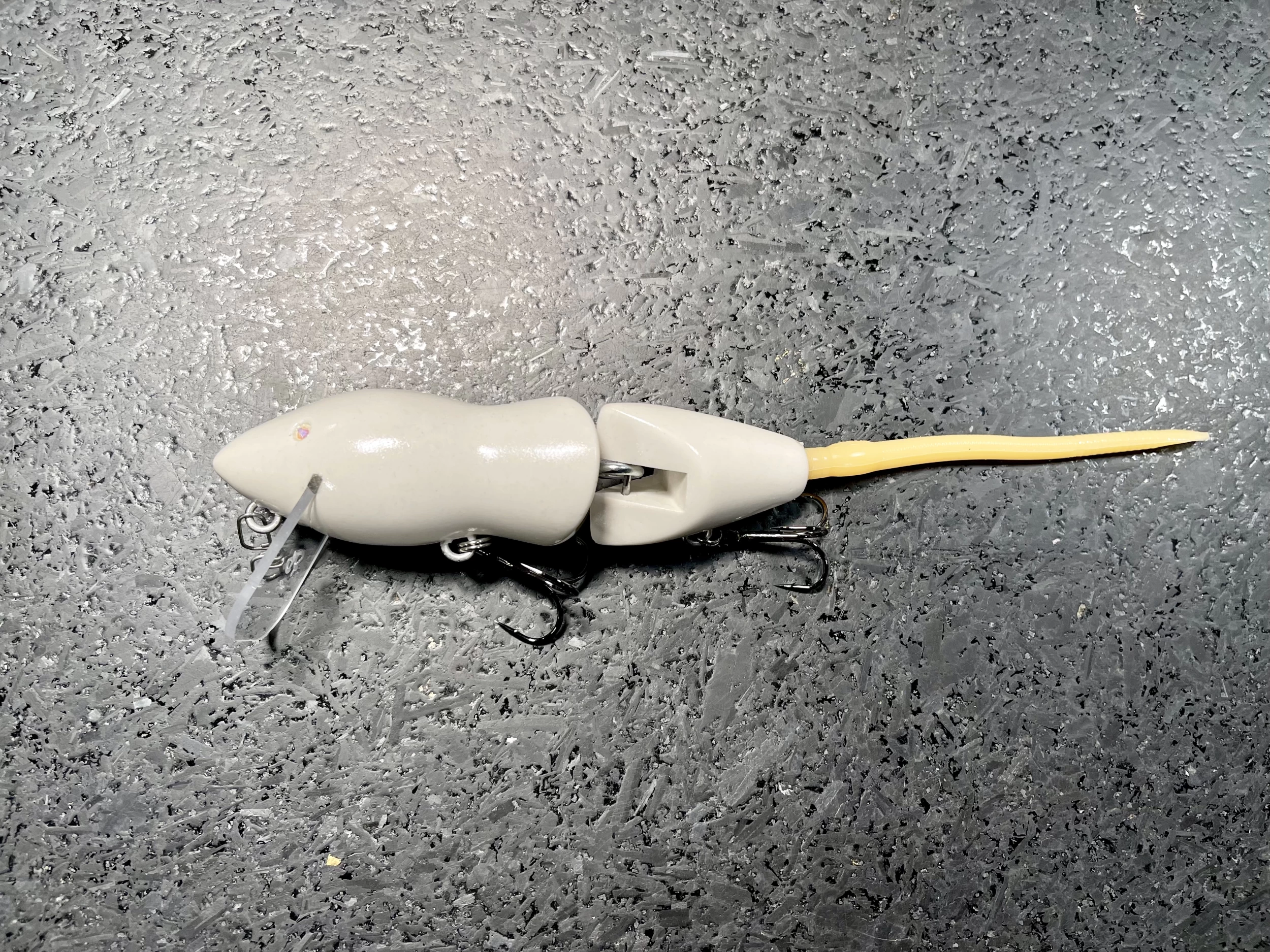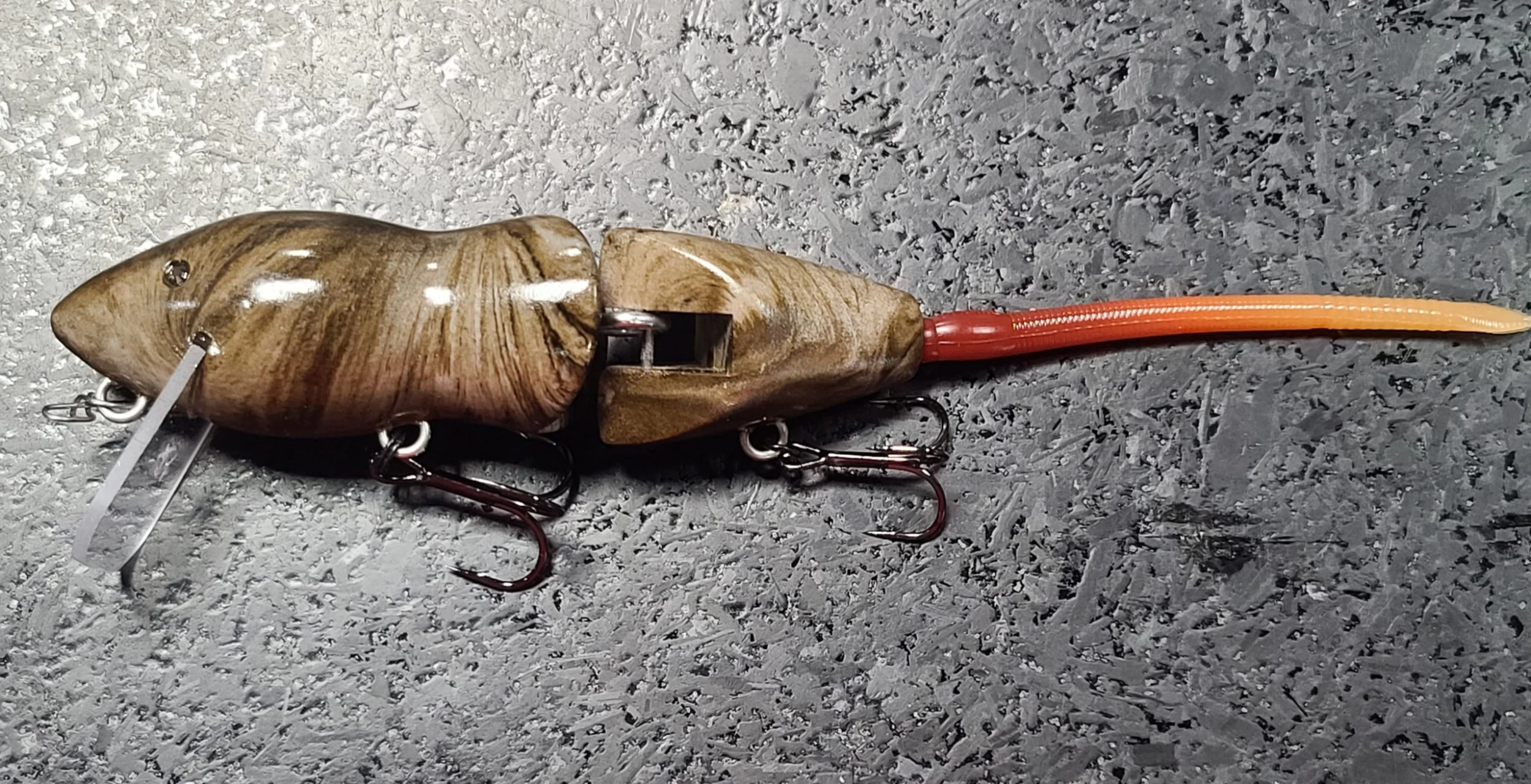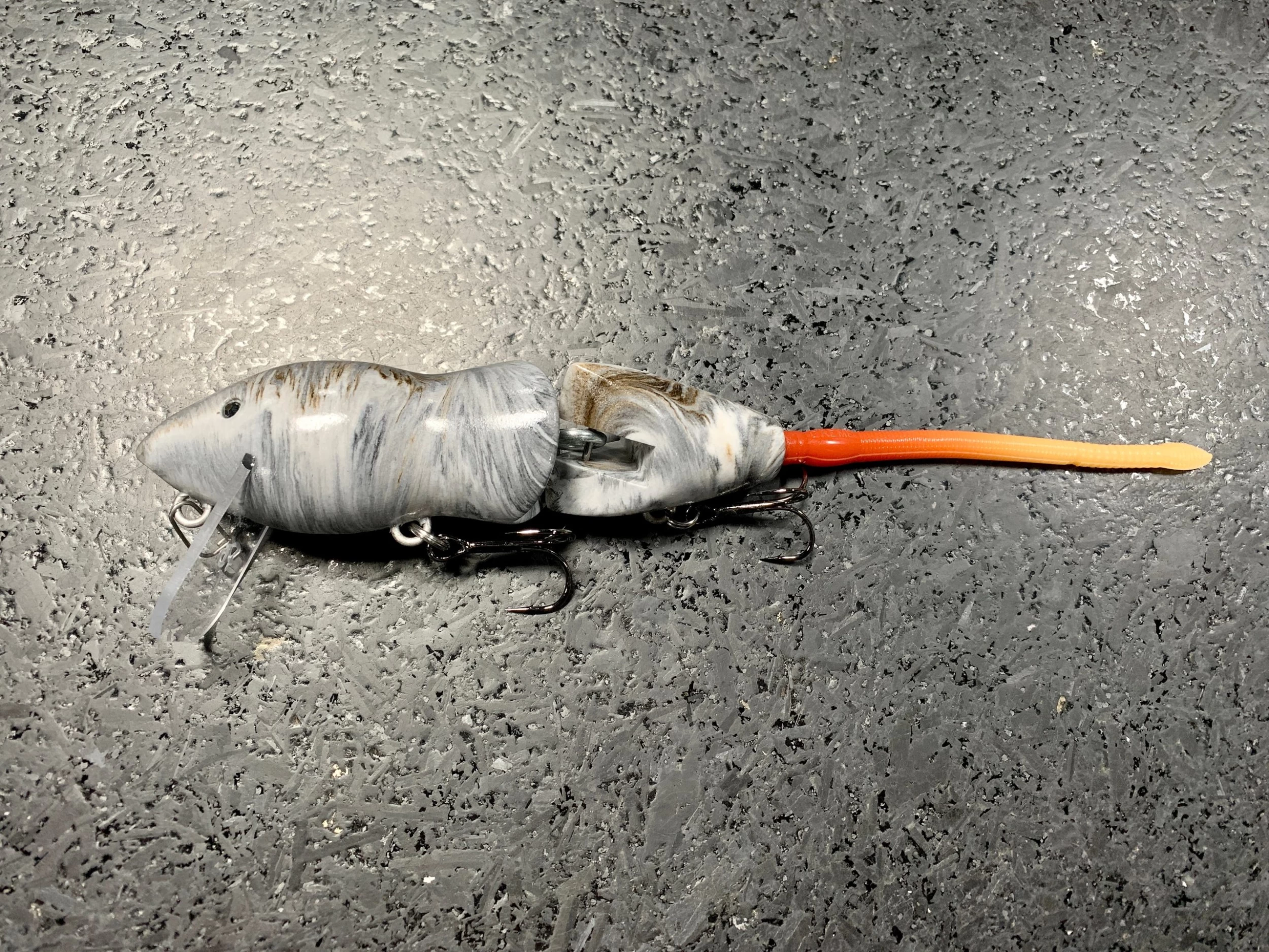 The PB Rats are a resin made rat wakebait designed with a sleek contour body and wide bill built for a wide searching action. The PB Rats are available in 2 piece and 3 piece body segment models, equipped with VMC split rings and Owner ST-36 size 1/0 trebles in the front and size 1 in the back. Each bait is hand made so the density of patterned swirls varies from bait to bait. Tails are screwed in with a cps twist lock and can be easily changed out and customized.