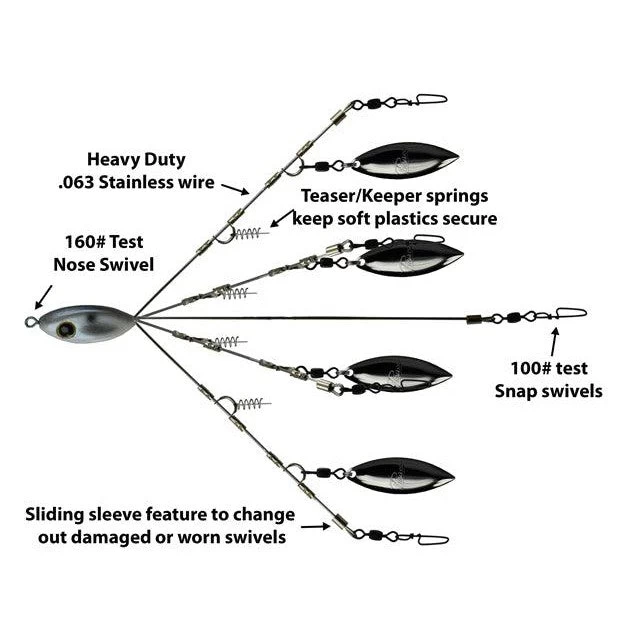 head,160# test imbedded nose swivel to prevent line twist and beefed up 100# test snap swivels to secure your swim baits.It also