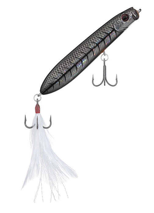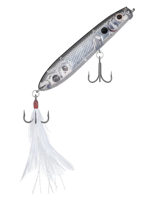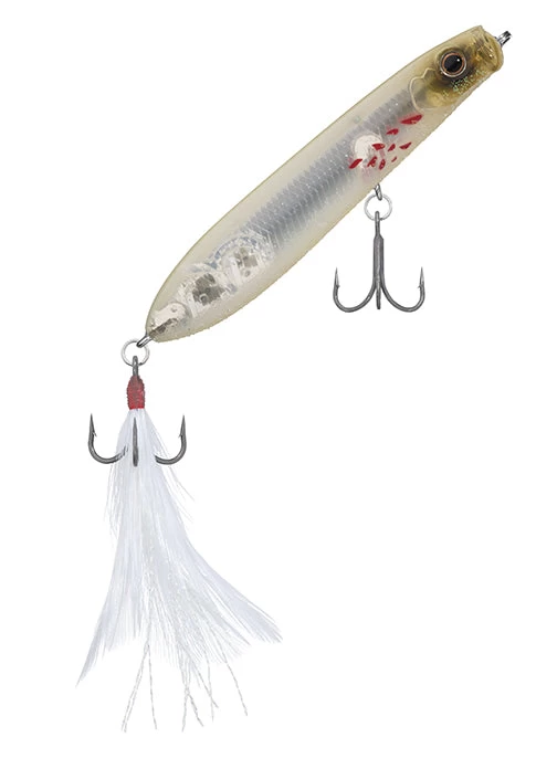 All the appeal of the Evergreen Shower Blows, now bite sized with the SB77.7. The unique bill produces powerful splatter, spit and bubbles that appeal to the fish. A body designed for air-resistance reduction, and tungsten weights at the very end of its tail guarantee incredible distance even against head winds. Excellent body balance allows it to make quick consecutive turns without jumping out of the water, making it move much like agitated bait fish chased by a bass. The feather hooks attached to the tail serve as “resonance” in the intervals between stillness and motion of an action, take those light bites of a fish unable to break above water into full-on bites, and help support the hook’s suction. On the other hand, the resistance created by the feather hooks has the effect of producing more sharpness to the bait’s quick turns.