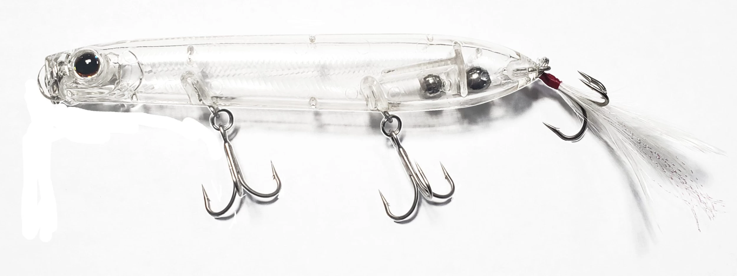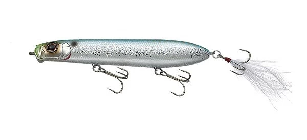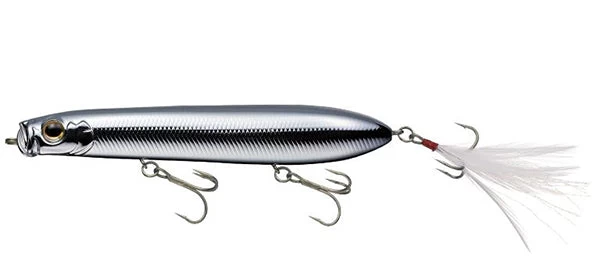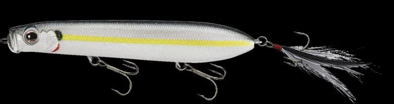 The Evergreen SB-105 and SB 125’s are in a league of their own. The unique bill produces powerful splatter, spit and bubbles that appeal to the fish. A body designed for air-resistance reduction, and tungsten weights at the very end of its tail guarantee incredible distance even against head winds. Excellent body balance allows it to make quick consecutive turns without jumping out of the water, making it move much like agitated bait fish chased by a bass. The feather hooks attached to the tail serve as “resonance” in the intervals between stillness and motion of an action, take those light bites of a fish unable to break above water into full-on bites, and help support the hook’s suction. On the other hand, the resistance created by the feather hooks has the effect of producing more sharpness to the bait’s quick turns.
