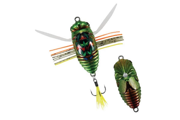 This “Bug” lure will induce bites with its silhouette and pulsation affect. The Realis Shinmushi has incorporated the actions of a “hard” body and “soft” rubber legs, creating a 3 dimensional pulsation the bass fancy. The most important factor for the “Bug” lure is the “sound” the bug makes when falling on the surface of the water. The hard body of the Shinmushi will enable any angler to create this effect. In addition, the rubber legs and feather on the tail hook will also induce bites from the bass. The wings works as a “stopper”, limiting the lure from traveling too far, while staging a “freestyle” swimming action when retrieving. Anglers will be able to approach the fish in a versatile manner. This ultimate “bug” lure will automatically induce bites from the bass while “stopping” it or “moving” it.