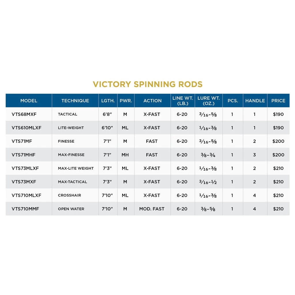 Designed and handcrafted in Park Falls Victory utilizing the combination of St. Croix’s proprietary SCVI and SCIII carbon fibers in a hybrid pattern blended to create SCIII+. Designed with the inputs of Bassheads nationwide, Victory features 25 balanced models focused on techniques, comfort, and the ultimate in fish ability and affordability backed by a 15 year transferable warranty, built in the USA.