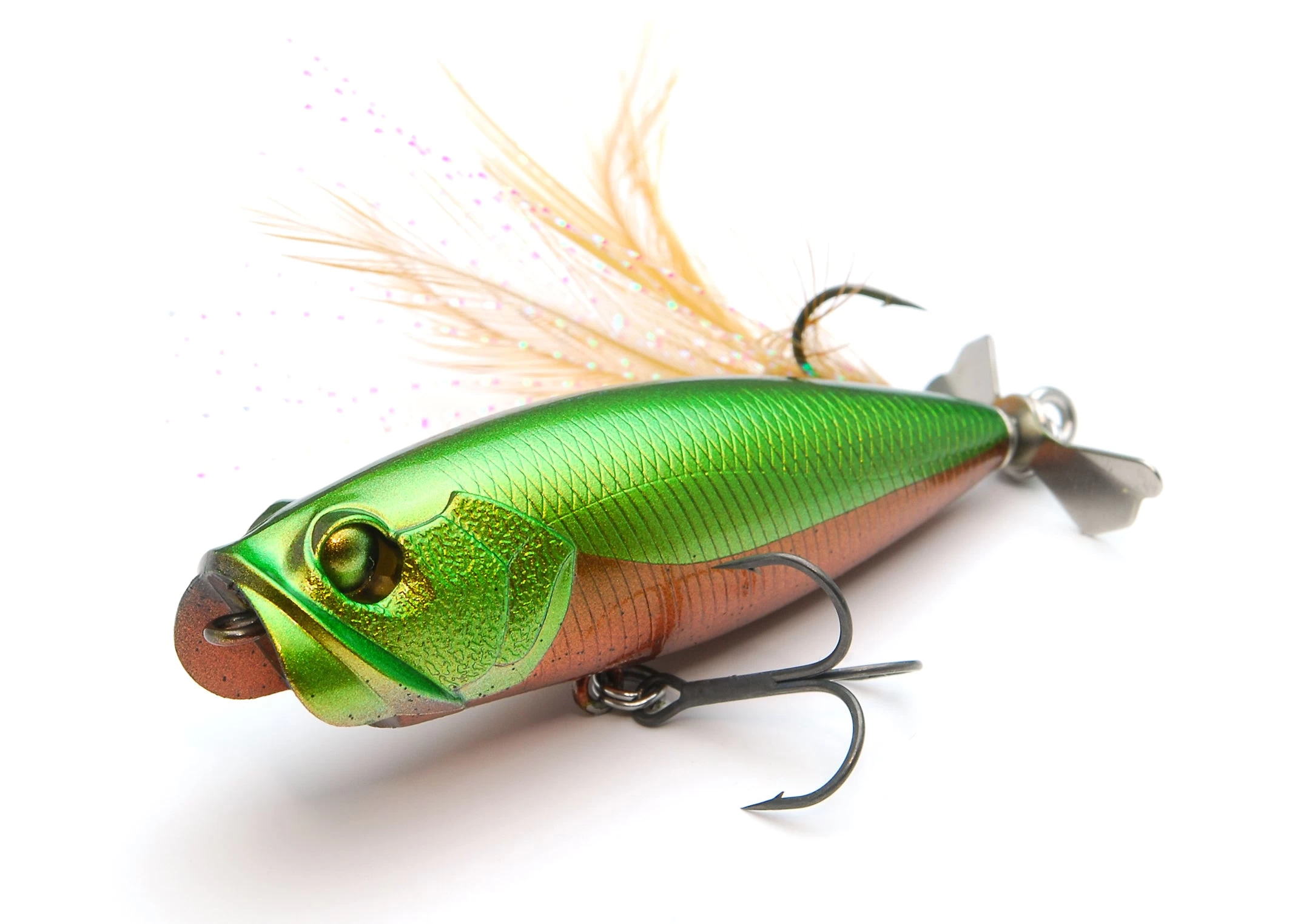 Anglers will be able to control this lure through various rod working techniques. The protruding mouth design creates vigorous splashing, speed and sounds to appeal to the deep bass. In addition, the original propeller attached to the tail of the lure will produce an amorous swishing sound, bubbles and a flashing effect to seek attention from the fish deep in the cover or in muddy water conditions. The lure also holds great strength to attract fish which are some distance away from the lure and then to produce bites.