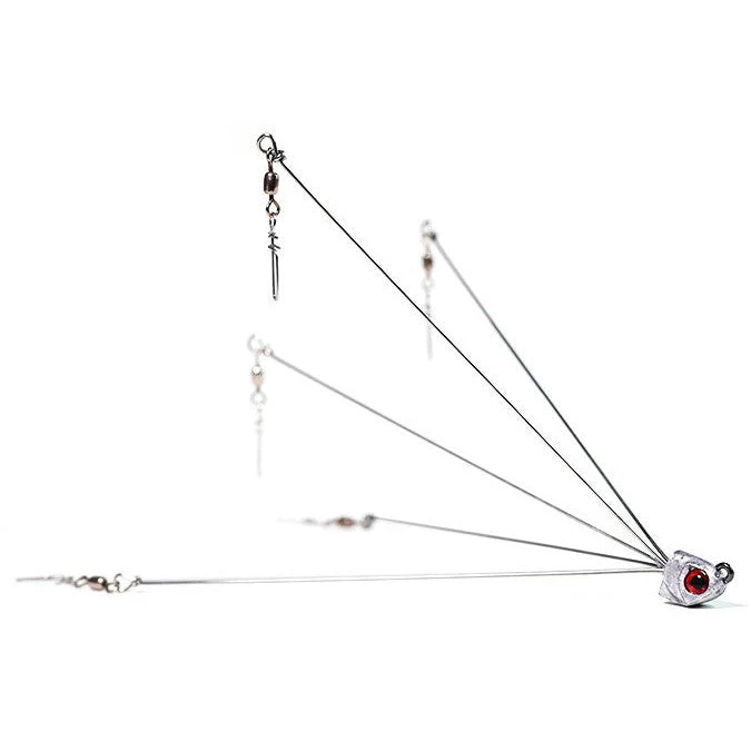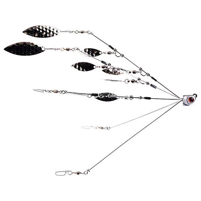 Warbaits War Umbrella Rig comes with and without premium blades to mimic schooling baitfish. Weighing in at 1/2oz, Warbaits unique head shape along with a compact design for easy casting and durable 5 arm wire construction made of stainless steel premium willow blades, premium stainless steel ball bearing swivels, tough 80lbs snap swivels, and 3D Bubble eyes. The War Rig is equipped to help you land the big one with stainless steel hex blades and premium stainless steel ball bearing swivels, allowing for superior maneuverability and enhanced durability.