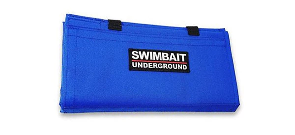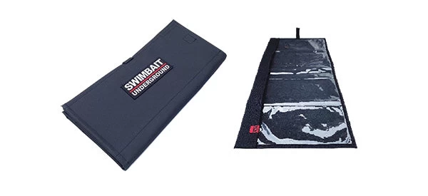 Swimbait Underground XL Bait Wrap. Constructed of premium 600D Nylon with 4 XL clear pockets to accommodate 12″ swimbaits. Pockets provide a button up Velcro closure and reinforced black seam to prevent wear and tear on pockets adding life to the wrap. Proper pocket spacing to allow complete closure while wrap is packed full of baits. Along with longer Velcro strap to keep wraps shut while on the go.